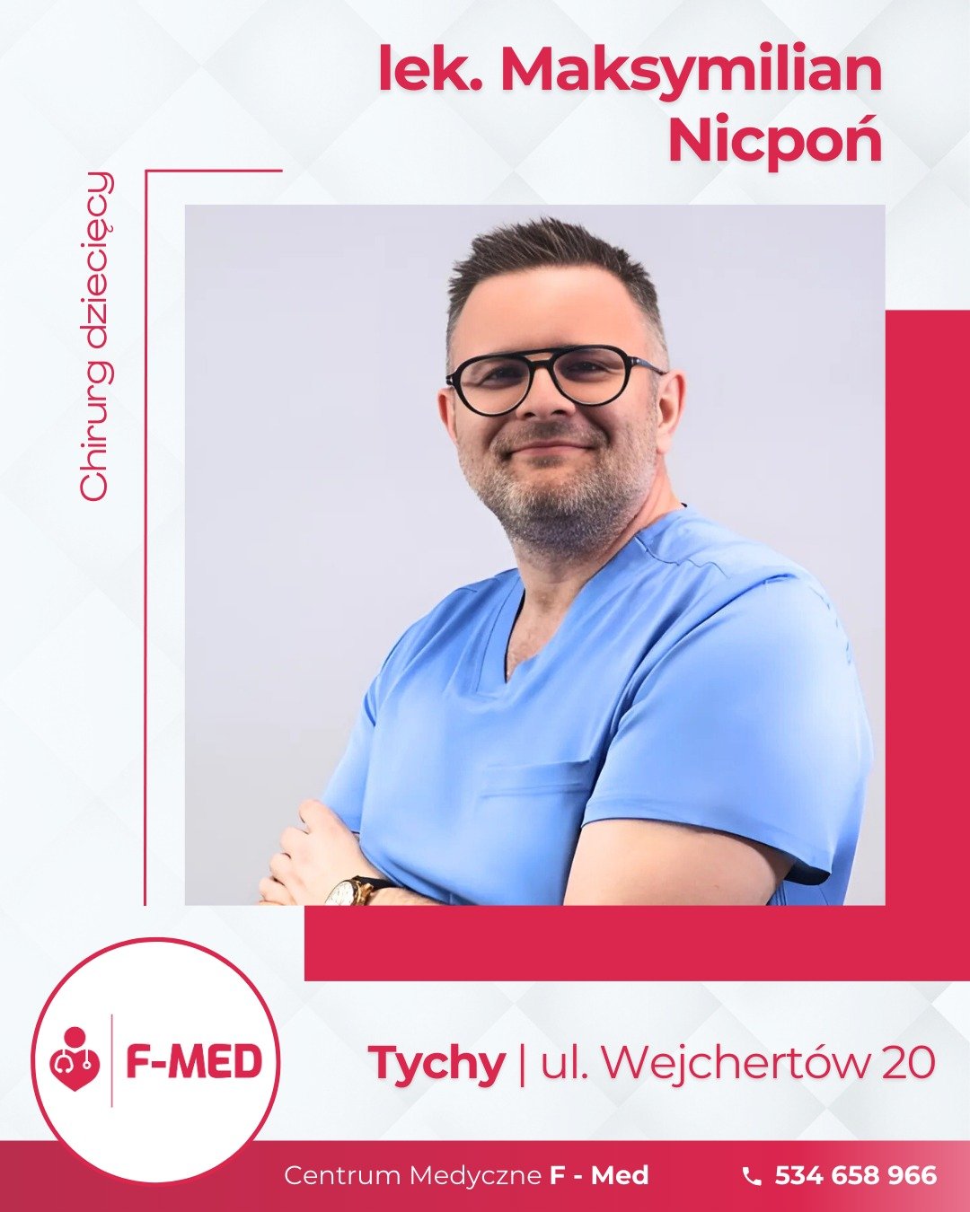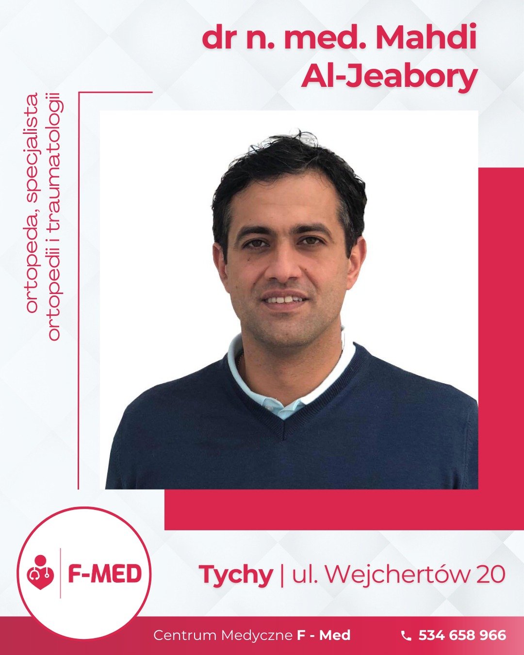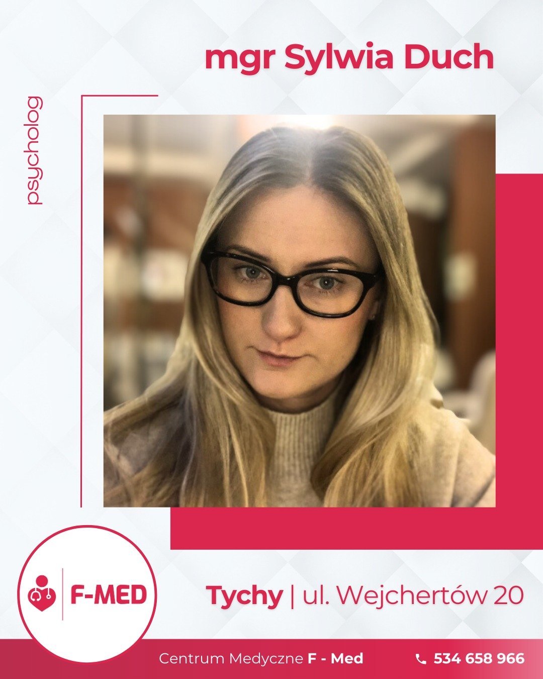 Centrum Medyczne F-Med w Tychach to nowoczesna placówka medyczna, oferująca kompleksową diagnostykę, leczenie oraz wsparcie terapeutyczne dla dzieci, młodzieży i dorosłych. Nasz zespół doświadczonych specjalistów zapewnia profesjonalną opiekę w wielu dziedzinach medycyny, dbając o najwyższe standardy usług oraz indywidualne podejście do każdego pacjenta. W F-Med świadczymy usługi z zakresu fizjoterapii, ortopedii, dietetyki klinicznej, neuropsychologii, psychologii sportowej, badań polipsychograficznych, a także oferujemy wsparcie psychoterapeuty i psychologa, pomagając pacjentom w trudnych momentach życiowych. Dodatkowo, zapewniamy specjalistyczną opiekę z zakresu dermatologii oraz chirurgii dziecięcej. Zapraszamy do umawiania wizyt.